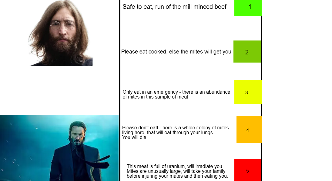 The beef potency rating is a scale on which any and all minced and roast beef lies. It denotes how powerful or deadly each Ulawaka of beef is, and is useful for beefologists. With the lowest Ulawaka (1 Ulawaka) of beef being your everyday beef, and the highest level (5 Ulawaka) being deadly to the average human, only being eaten raw by Echidnas. Below is the actual scale, endorsed by John Wick and lennon. The units are mainly based upon how many stupid mites there are in the meat, where the more mites, the more potent the meat.